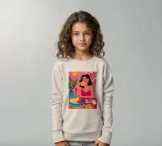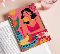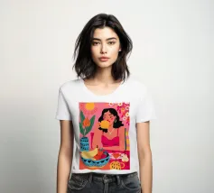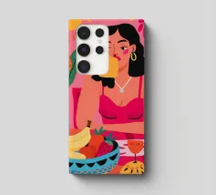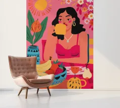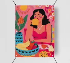 Ritratto di una donna che si gode il sole, circondata da un motivo di banane e foglie tropicali. La scena è una vibrante, allegra ed elegante celebrazione dell'estate, della frutta e della felicità.