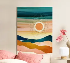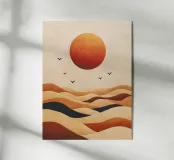 Illustrazione artistica di un paesaggio desertico con un sole rosso intenso che fluttua sopra dune ondulate in tonalità terrose. Un poster perfetto per una decorazione murale calda e minimalista, ideale per un ambiente rilassante e bohémien.