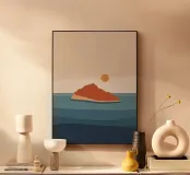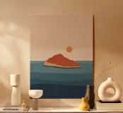 Abbracciate la profonda bellezza della serena solitudine. Questo paesaggio minimalista cattura il momento di quiete in cui il sole bacia l'orizzonte, proiettando una calda luce su un mare tranquillo. Utilizzando forme semplici e una tavolozza di terracotta e blu tenui, questo pezzo è un invito aperto a fermarsi, respirare e trovare un momento di tranquillità in un mondo affollato. È l'opera d'arte perfetta per creare un punto focale calmo e meditativo in salotto, in camera da letto o in qualsiasi altro spazio in cui si cerchi pace e una dolce evasione.