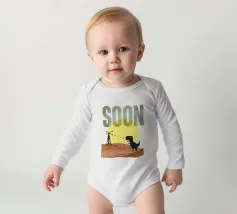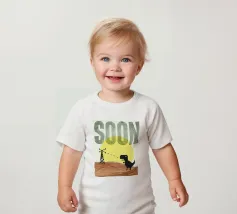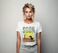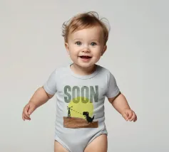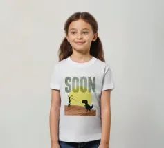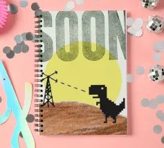Poster tipografico divertente a tecnica mista. Dinosauro del wifi alla ricerca di una migliore ricezione. Stampa tipografica sconvolta che dice presto. Collage di grafica retrò di MsGonzalez
