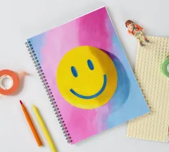 Faccina colorata su sfondo rosa e blu, dipinta a mano in stile minimalista ad olio. Perfetto per le camere dei bambini, i libri per bambini o le decorazioni allegre per le stanze. Colori vivaci, forme semplici e scene oniriche per il buon umore.