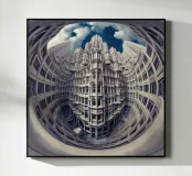 Una prospettiva fisheye surreale che mostra una torreggiante architettura gotica futuristica con dettagli intricati e motivi simmetrici, sullo sfondo di un cielo blu vibrante con nuvole drammatiche. L'immagine evoca la modernità mescolata a elementi di design classico.