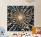 Un design architettonico intricato che forma una struttura a tunnel con simmetria a raggiera, che converge verso una luce incandescente al centro. La prospettiva crea profondità e un'estetica ipnotica e futuristica.