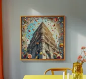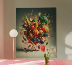 Una stravagante rappresentazione di un edificio storico con dettagli intricati circondato da un cielo vibrante pieno di frutta e verdura galleggianti. La composizione surreale fonde architettura e fantasia per una visione creativa e colorata.
