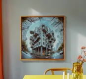 Un sorprendente edificio modulare con elementi futuristici, tubi e strutture sferiche, circondato da un paesaggio urbano distorto. La composizione fantasiosa fonde l'architettura moderna con il surrealismo, creando una prospettiva unica e dinamica.