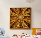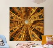 Una vista ipnotizzante di pareti architettoniche dorate che si curvano verso l'interno per formare un motivo circolare, creando un radioso disegno simmetrico. I dettagli intricati e i toni caldi evocano grandezza e raffinatezza artistica in una prospettiva surreale.