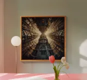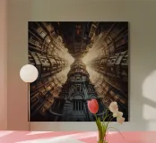 Una rappresentazione surreale di strutture architettoniche simmetriche e torreggianti che convergono verso una luce centrale incandescente. I disegni intricati, l'illuminazione calda e la prospettiva drammatica creano un'immagine impressionante e ultraterrena.