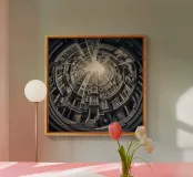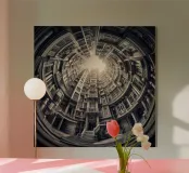 Questa immagine mostra una scena architettonica surreale con edifici concentrici disposti circolarmente. I toni monocromatici aggiungono un tocco vintage, mentre il centro illuminato dal sole crea profondità e un'illusione di altezza infinita.