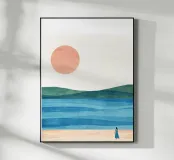 Una donna cammina da sola su una soffice spiaggia sabbiosa, il sole tramonta all'orizzonte in un caldo colore arancione e l'acqua azzurra lo lambisce dolcemente. Il dipinto esprime un senso di pace interiore e di connessione.