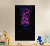 Un ritratto luminoso e contemporaneo che visualizza il pensiero come luce e movimento. Da una figura calma e ben salda si alza un'ondata di filamenti luminosi, che si intrecciano e si attorcigliano in colori vivaci contro un vuoto nero profondo. Il contrasto tra immobilità ed energia crea un potente senso di emergere, come se emozioni, ricordi o immaginazione stessero rompendo la superficie.