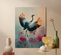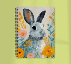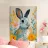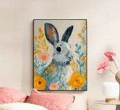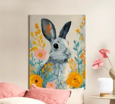 Un dolce coniglietto circondato da fiori dorati e tenui colori pastello. Perfetto per le decorazioni primaverili e pasquali, questo allegro dipinto aggiunge un tocco di giocosità e fascino naturale a qualsiasi casa.