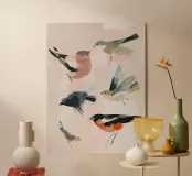 Poster di uccelli, arte murale botanica, poster rosa pastello
