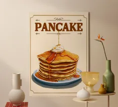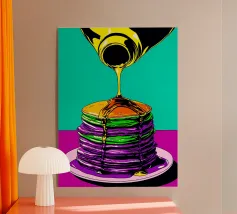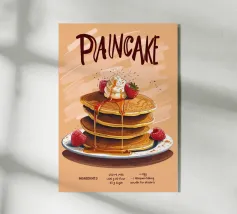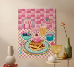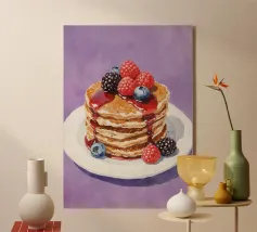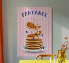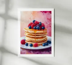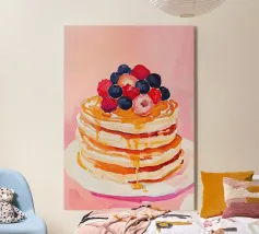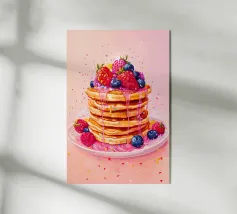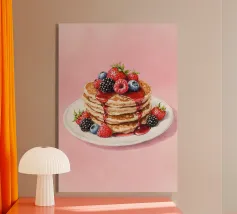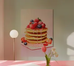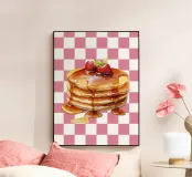 Una pila di pancake è sormontata da fragole e irrorata di sciroppo, su uno sfondo a scacchi bianchi e rosa. I colori vivaci e lo sciroppo lucido creano un aspetto invitante.