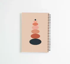 Una serie di forme ovali impilate, di dimensioni e tonalità diverse, formano una torre. I colori passano dolcemente da toni scuri in basso a toni più chiari in alto, culminando in un piccolo cerchio scuro.