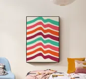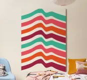 Un poster digitale Op Art e retrofuturistico che presenta linee ondulate orizzontali in una vibrante tavolozza Mid-Century Modern. I colori - verde acqua, rosa caldo, arancione brillante e bordeaux intenso - sono separati da sottili strisce bianche, creando un senso dinamico di profondità e movimento, quasi come un paesaggio desertico colorato o le onde sonore. Questo design vivace aggiunge un immediato tocco vintage e un divertimento massimalista a qualsiasi spazio. Questo download digitale di alta qualità vanta 7000x5000 pixel a 300 dpi, garantendo una chiarezza eccezionale e una qualità di stampa superiore per l'arte di grande formato.