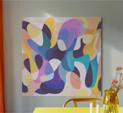 Un vivace motivo astratto caratterizzato da un'armoniosa miscela di tonalità blu, viola e arancione. Questo disegno moderno e minimalista presenta curve geometriche morbide e forme fluide, creando un'estetica giocosa ma elegante. Questo disegno astratto presenta un'interazione dinamica di elementi audaci e morbidi, mescolando ricche tonalità di blu, viola e arancione in una composizione fluida e scorrevole. Moderno e minimalista nella struttura, il disegno utilizza curve geometriche e forme organiche per creare un senso di movimento e armonia.