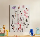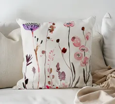 A graceful tangle of wild stems, buds, and blooms painted in soft rose, violet, and espresso ink tones. This vertical composition captures the quiet elegance of garden flora with a minimalist spirit—airy, spontaneous, and full of rhythm.
