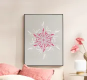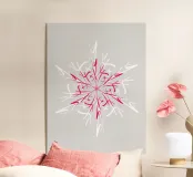 Design invernale: una stella dinamica a sei punte disegnata a mano in bianco e rosa magenta su uno sfondo grigio argento.
