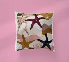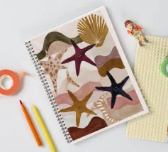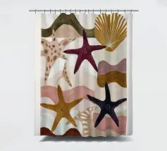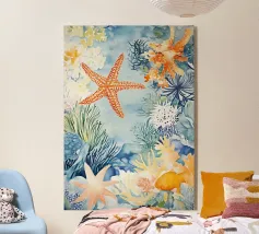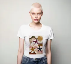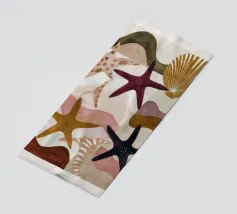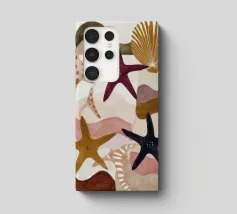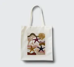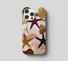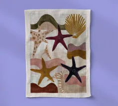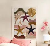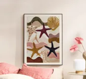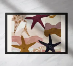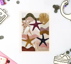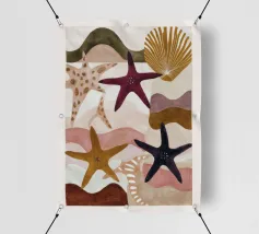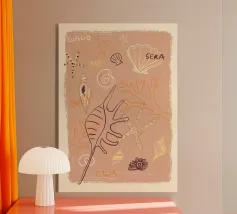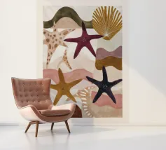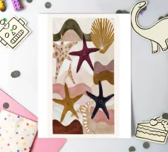 Una composizione delicata con stelle marine, conchiglie e forme fluide nei caldi toni della terra e della sabbia. L'opera trasmette una calma sensazione di mare attraverso il colore e l'equilibrio.