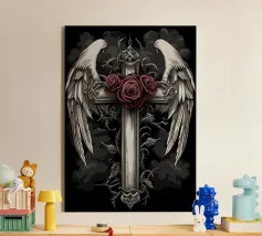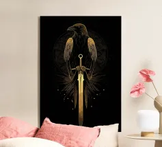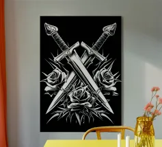 Questa dettagliata opera d'arte combina l'araldica classica con elementi simbolici e oscuri. Al centro, un possente corvo ad ali spiegate, appollaiato su due teschi e una corona di spine. La composizione è incorniciata da nastri decorativi, spade e ornamenti floreali che ricordano gli stemmi tradizionali. La palette cromatica monocromatica di toni neri e grigi rafforza il carattere mistico e drammatico del motivo. Ideale per gli amanti dell'estetica gotica, del simbolismo oscuro e delle illustrazioni dettagliate, quest'opera è perfetta per gli amanti del genere.