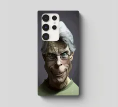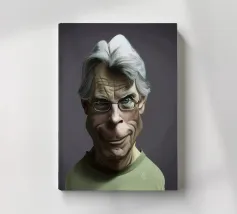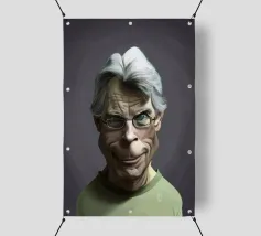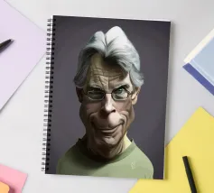 Illustrazione caricaturale umoristica del noto autore americano di romanzi horror, soprannaturali, di suspense, gialli, di fantascienza e fantasy Stephen King. Una delle caricature realizzate per la serie Celebrity Sunday, in cui un personaggio famoso viene ritratto nell'arco di una giornata. L'idea è di mostrarli come in una fototessera per avere coerenza.