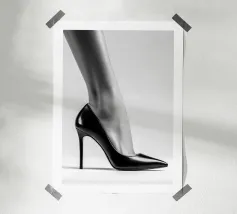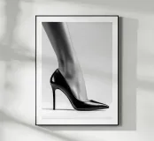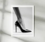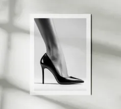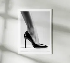 Poster di moda in bianco e nero: un tacco a spillo in pelle lucida slancia la gamba con una linea grafica, su uno sfondo chiaro e minimalista. Riflessi sottili, curve sensuali e punta affusolata creano un'immagine chic, moderna e senza tempo. Questo poster da parete conferisce eleganza e carattere a un soggiorno, uno spogliatoio, una camera da letto o un negozio. Ideale per un arredamento contemporaneo, minimalista, industriale o scandinavo.