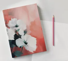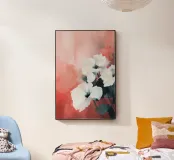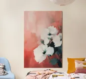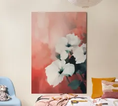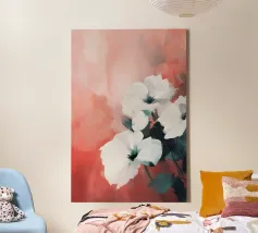 I fiori bianchi emergono delicatamente da stratificati toni corallo e blush, le loro forme sono sciolte ma intenzionali. La pennellata morbida e il contrasto tenue creano un senso di presenza silenziosa, un momento sospeso tra tenerezza e calma. Questo pezzo evoca morbidezza senza fragilità, offrendo calore, spazio e sobria eleganza.