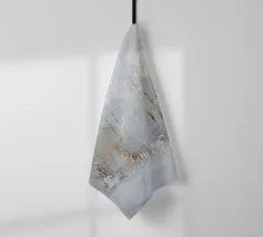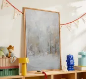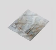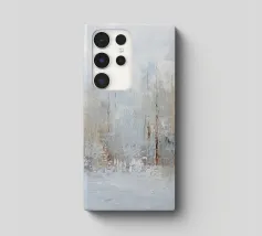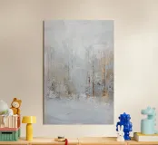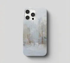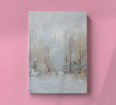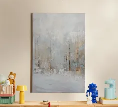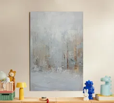 Un sereno dipinto contemporaneo che cattura un tranquillo paesaggio invernale attraverso morbidi strati di blu pallido, bianchi tenui e sottili toni terrosi. Delicati segni verticali suggeriscono alberi spogli che si dissolvono nella nebbia, mentre le pennellate strutturate evocano silenzio, distanza e calma riflessione. La composizione è atmosferica e meditativa, ideale per stampe d'arte di grande formato, interni minimalisti e spazi di gallerie moderne.