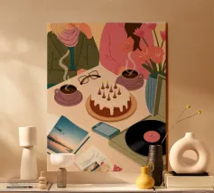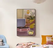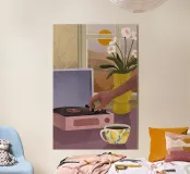 Questa accogliente illustrazione in stile stilistico con colori caldi ritrae una mano umana che suona un disco su un vecchio giradischi. Una tazza di caffè, un vaso di fiori davanti a una finestra con un bel paesaggio completano l'immagine.