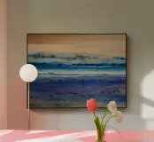 Un rilassante paesaggio marino astratto ad acquerello, che cattura il movimento stratificato dell'oceano e del cielo in delicate tonalità di indaco, sabbia e viola tenue. Perfetto per un arredamento costiero moderno o per creare un'atmosfera pacifica e ispirata all'oceano.