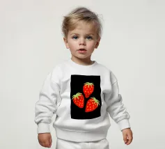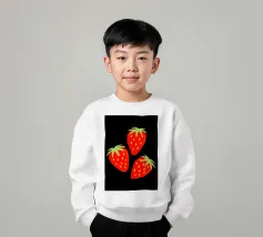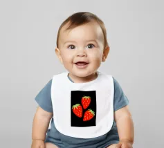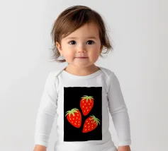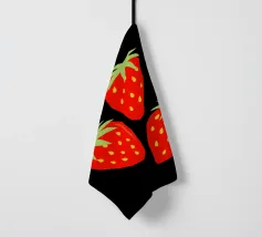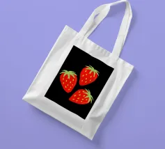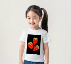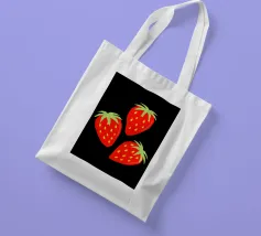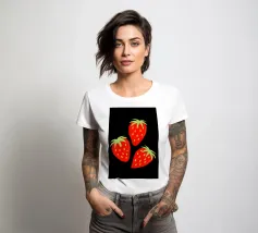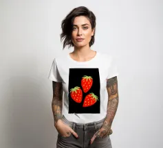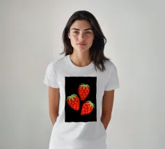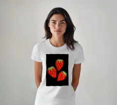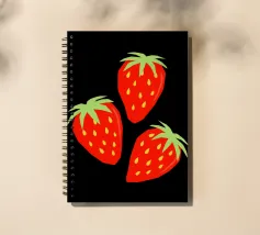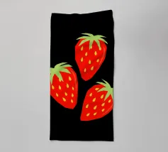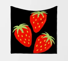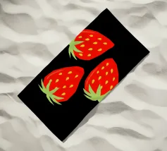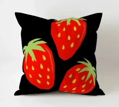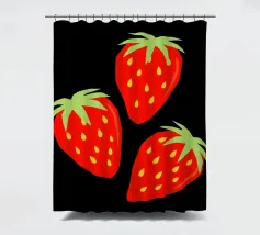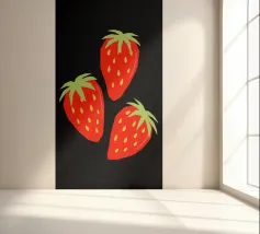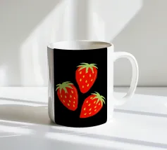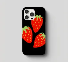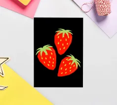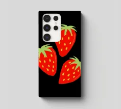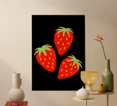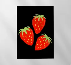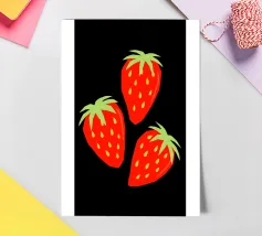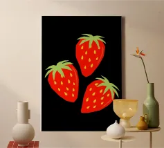 Le fragole rosse sono disposte su un solido sfondo nero, mentre le foglie verdi creano un vibrante contrasto. Ogni fragola presenta piccoli semi gialli, posizionati in un layout semplice e pulito.