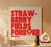 "Le parole 'Strawberry Fields Forever' sono impilate verticalmente in caratteri rossi su uno sfondo chiaro, con una fragola a fette che sostituisce lo '0' di 'Forever', creando un'atmosfera stravagante e nostalgica",