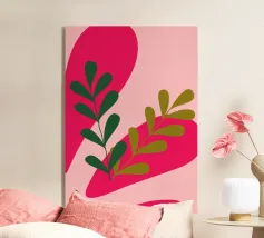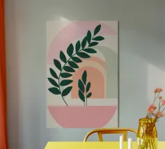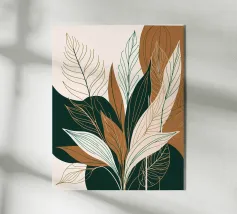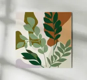 Questo studio botanico sereno ed elegante mostra varie foglie e rami verdi su uno sfondo neutro e colorato. La sua composizione pulita ed equilibrata è perfetta per creare un'atmosfera rilassante e naturale, celebrando la semplice bellezza del fogliame.