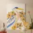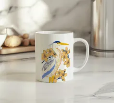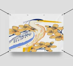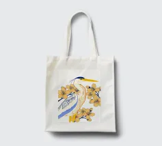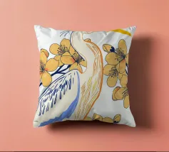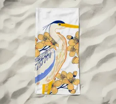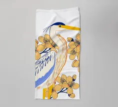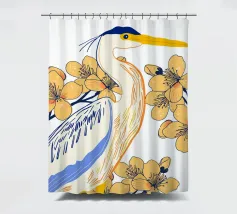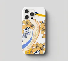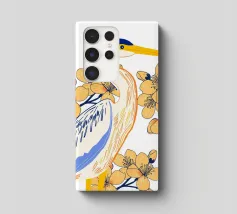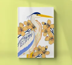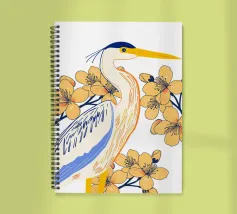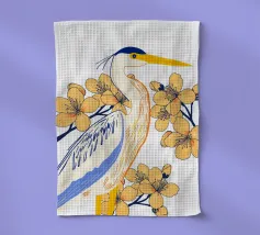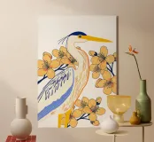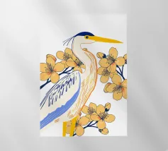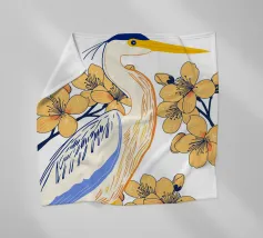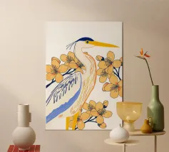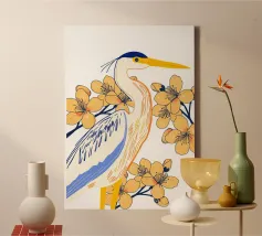 Un airone stilizzato dal lungo collo e dal becco arancione si staglia con grazia su uno sfondo di fiori gialli e vivaci. Il piumaggio dell'uccello presenta accenti blu e arancioni che completano la composizione floreale. La composizione emana un'estetica vivace e colorata.
