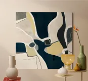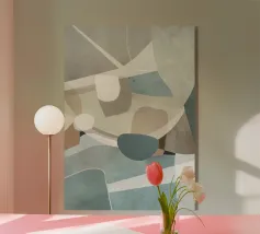 Composizione astratta di varie forme nei toni del beige, del bianco sporco, del blu scuro e del nero. Le forme sono irregolari e stratificate, con aree di colore pieno e aree di texture. Alcune linee e tratti bianchi definiscono i bordi delle forme. L'opera presenta prevalentemente toni neutri con punte di giallo ocra. La composizione è equilibrata, con forme di dimensioni diverse disposte in tutta l'immagine. I colori sono tenui e creano un'atmosfera calma e serena. L'impressione generale è quella di forme e texture organiche.