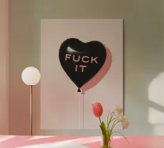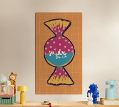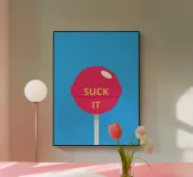 Un lecca-lecca rosa con la scritta "SUCK IT" in lettere gialle. La superficie lucida della caramella aggiunge un tocco giocoso al disegno.