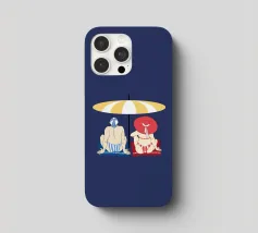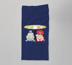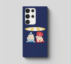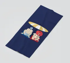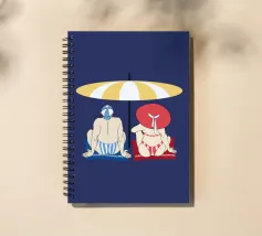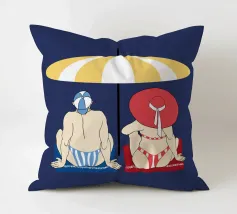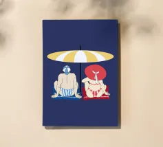 Uomo e donna seduti sotto un ombrellone giallo e bianco sulla spiaggia