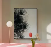 Un espressivo studio a inchiostro di aghi di pino che esplodono sulla carta come fuochi d'artificio in monocromia. L'opera bilancia i dettagli lineari e nitidi con schizzi e lavaggi sanguinanti, evocando sia il caos che il controllo in un'estetica di chiara ispirazione orientale. Ideale per interni moderni, temi di design calligrafico o mazzi botanici lunatici.