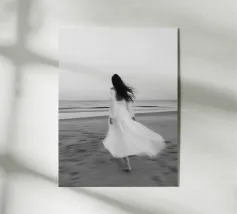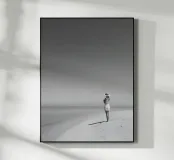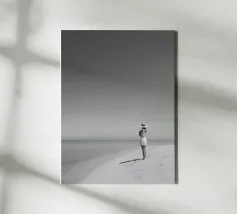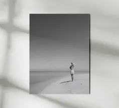 Una persona sola che cammina lungo una spiaggia vuota, circondata da un cielo immenso e da un orizzonte aperto. Tranquilla, minimale e profondamente rassicurante: una fotografia che respira quiete.