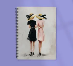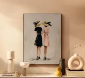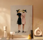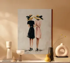 Due donne in abiti eleganti e cappelli a tesa larga condividono un momento di tranquillità in riva al mare. Questa opera d'arte figurativa minimalista irradia amicizia, libertà ed energia femminile. Perfetta per interni boho o per case costiere da sogno.