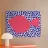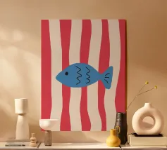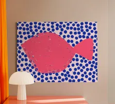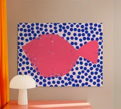 Un pesce rosso dipinto a mano su punti stampati blu con sfondo rosa.