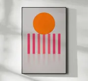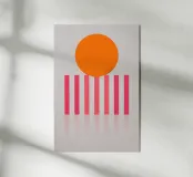 Un cerchio arancione brillante fluttua sopra sette barre verticali rosa, come un sole astratto sopra un paesaggio geometrico. Quest'opera d'arte minimalista emana una tensione quasi meditativa grazie alla sua chiarezza, alla simmetria e ai contrasti di colore. Ideale per ambienti moderni che privilegiano il colore, la forma e la tranquillità.