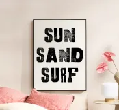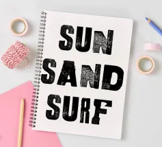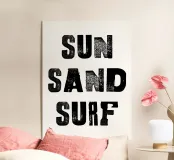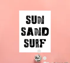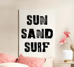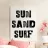 Il testo nero, in grassetto e affilato, recita "SUN SAND SURF" in una disposizione impilata verticalmente su uno sfondo bianco. Il design evoca un senso di vita da spiaggia e vibrazioni estive.