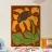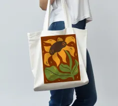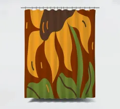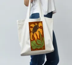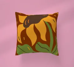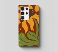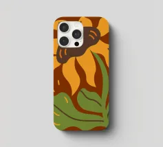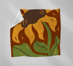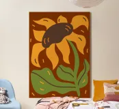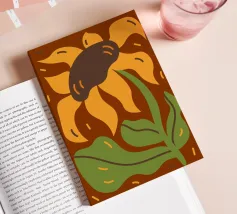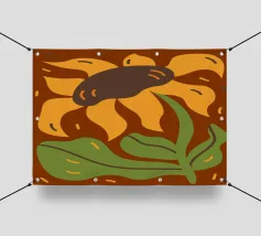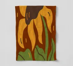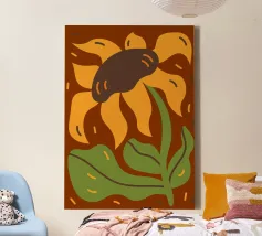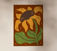 Un girasole stilizzato con grandi petali gialli e foglie verdi si staglia su uno sfondo marrone caldo. Il disegno utilizza forme audaci e semplificate e colori contrastanti.