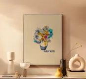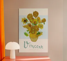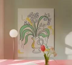 Illuminate qualsiasi spazio con questa espressiva illustrazione di bouquet di girasoli. Il disegno a inchiostro libero prende vita con sovrapposizioni di giallo caldo, verde acqua e magenta, fondendo il fascino floreale classico con l'arte moderna astratta. Ideale per cucine, studi o pareti di gallerie.