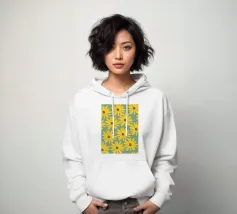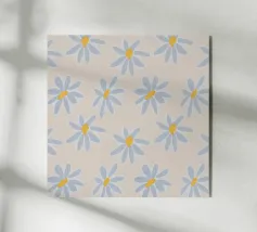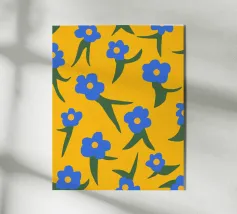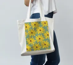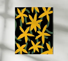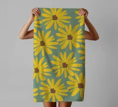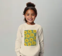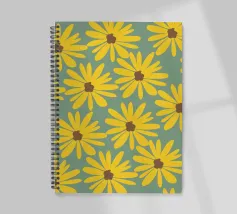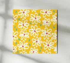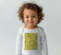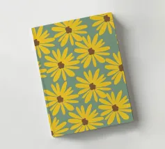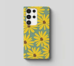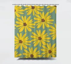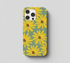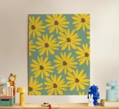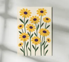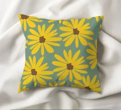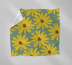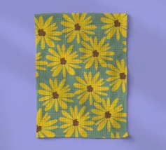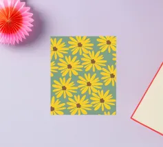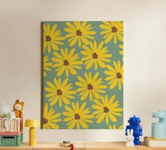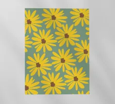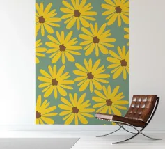 Fiori gialli brillanti con centri marroni sono disposti a ripetizione su uno sfondo verde tenue. Il design semplice e deciso conferisce un aspetto allegro e vivace.