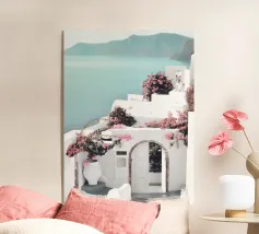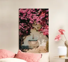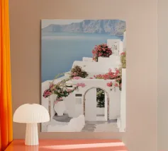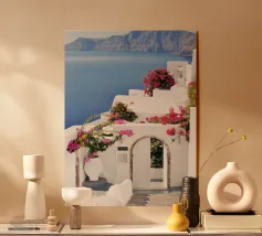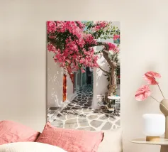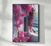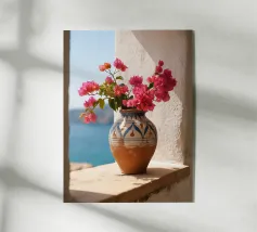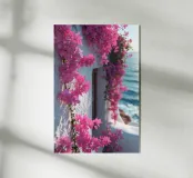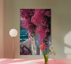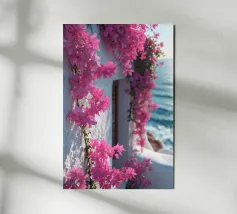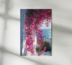Questa fotografia cattura magnificamente i radiosi fiori di bouganville in piena fioritura contro un muro imbiancato a calce con il Mar Egeo sullo sfondo. I vibranti fiori magenta risaltano in modo drammatico sotto la calda luce del sole, creando un netto contrasto con la texture liscia del muro. Le onde scintillano sotto il cielo limpido, armonizzandosi con l'energia dei fiori. Questa scena illustra perfettamente il fascino unico del Mediterraneo, dove natura e architettura coesistono in perfetta armonia.