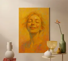 Un volto tranquillo si crogiola in una radiosa foschia gialla, con gli occhi dolcemente chiusi in segno di beatitudine, mentre la calda luce del sole inonda ogni pennellata. Delicati accenti rosa e verde acqua danzano come pollini nell'aura dorata, catturando un momento di appagamento e calore. La morbida texture impressionistica evoca ricordi di mattinate pigre e di tranquilla gratitudine. Stampato con pigmenti di qualità d'archivio su carta opaca pesante, questo allegro ritratto illumina camere da letto, angoli di lettura o sale da sole, invitando gli spettatori a fermarsi, respirare profondamente e immergersi nelle semplici gioie della vita.