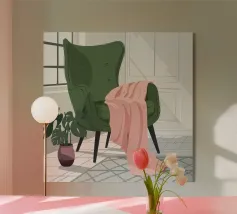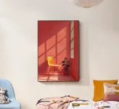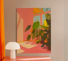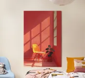 Una composizione minimalista dove un'unica sedia gialla e una pianta in vaso riposano tranquillamente in un angolo illuminato dal sole. Le ombre si allungano sulle pareti coralline, creando un equilibrio armonioso tra geometria, luce e quiete. L'opera evoca un senso di calma e solitudine riflessiva, celebrando la semplicità negli spazi abitativi moderni.