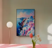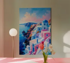 Questo squisito dipinto cattura l'alba sulle cupole blu a cascata e sugli edifici imbiancati di Oia, a Santorini. La tecnica impressionista mette in risalto i caldi toni pastello del cielo dell'alba, armonizzandoli con i blu freddi del mare e dell'architettura. Le scogliere frastagliate e le acque tranquille esaltano l'accattivante bellezza dell'isola, creando un'opera d'arte che celebra la serenità e il fascino vibrante della destinazione più iconica della Grecia. Questo capolavoro è un omaggio all'eleganza senza tempo e all'ispirazione artistica di Santorini.